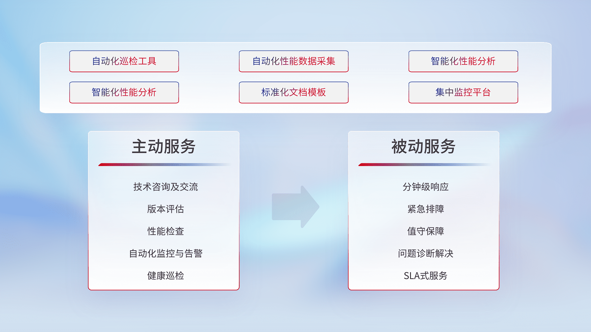 智能化工具和标准化文档,,,,保障服务质量,,,,提供主动服务(包含技术咨询、、、、版本评估、、性能检查、、、、自动化监控与告警、、、健康巡检)和被动服务包含(分钟级响应、、、紧急排障、、、、值守保障、、、、问题诊断解决、、、、SLA服务)。。。。
