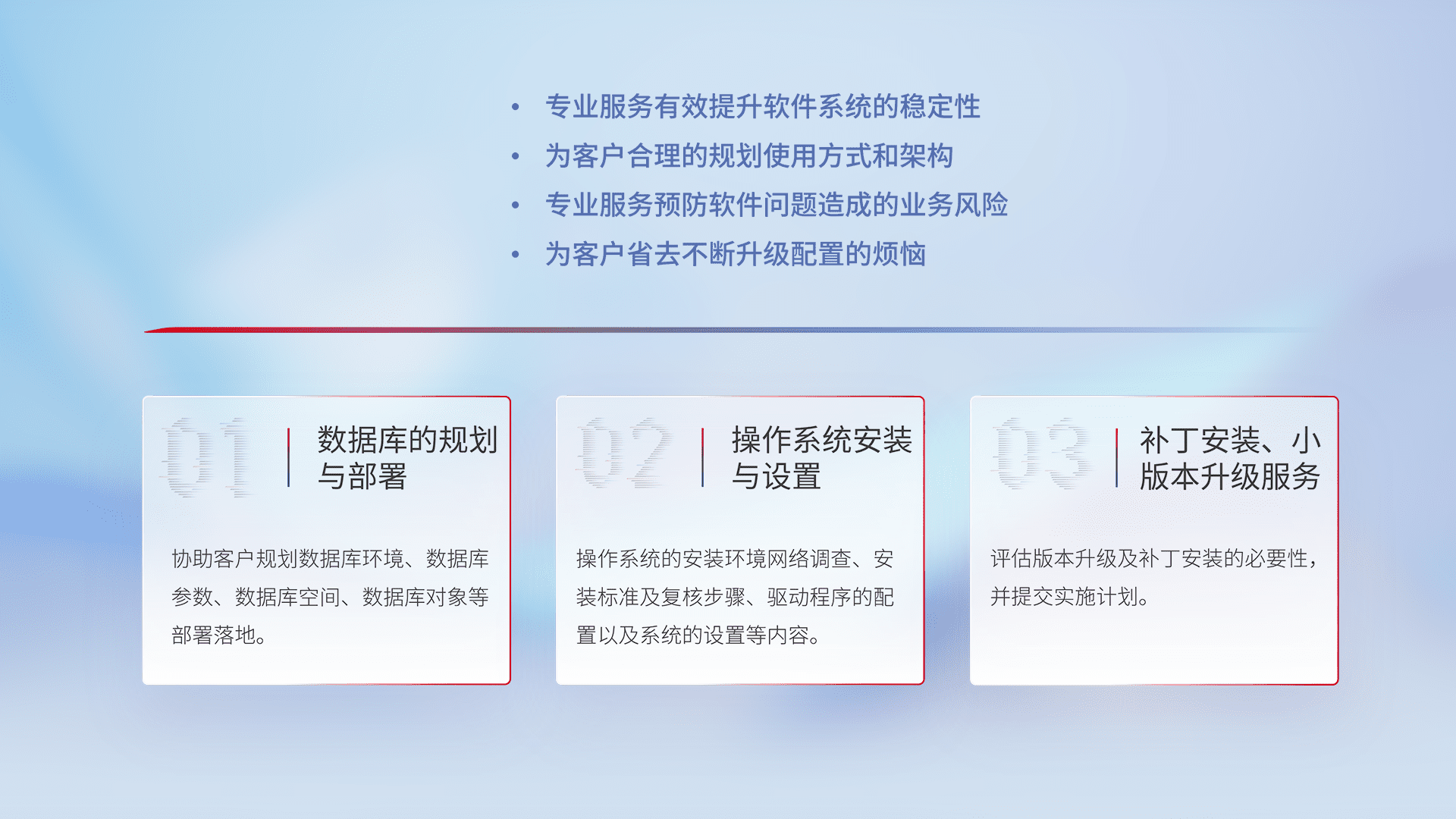 为客户提供软件规模升级、、快速部署、、按需配置的专业服务,,,从数据库的规划与部署到操作系统的安装与设置,,再到补丁安装和小版本升级提供支持。。。
